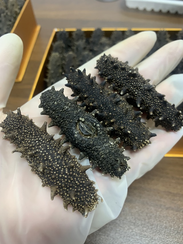 (淡干海参颜色正常,盐干海参颜色发白,糖干海参有油黑色)